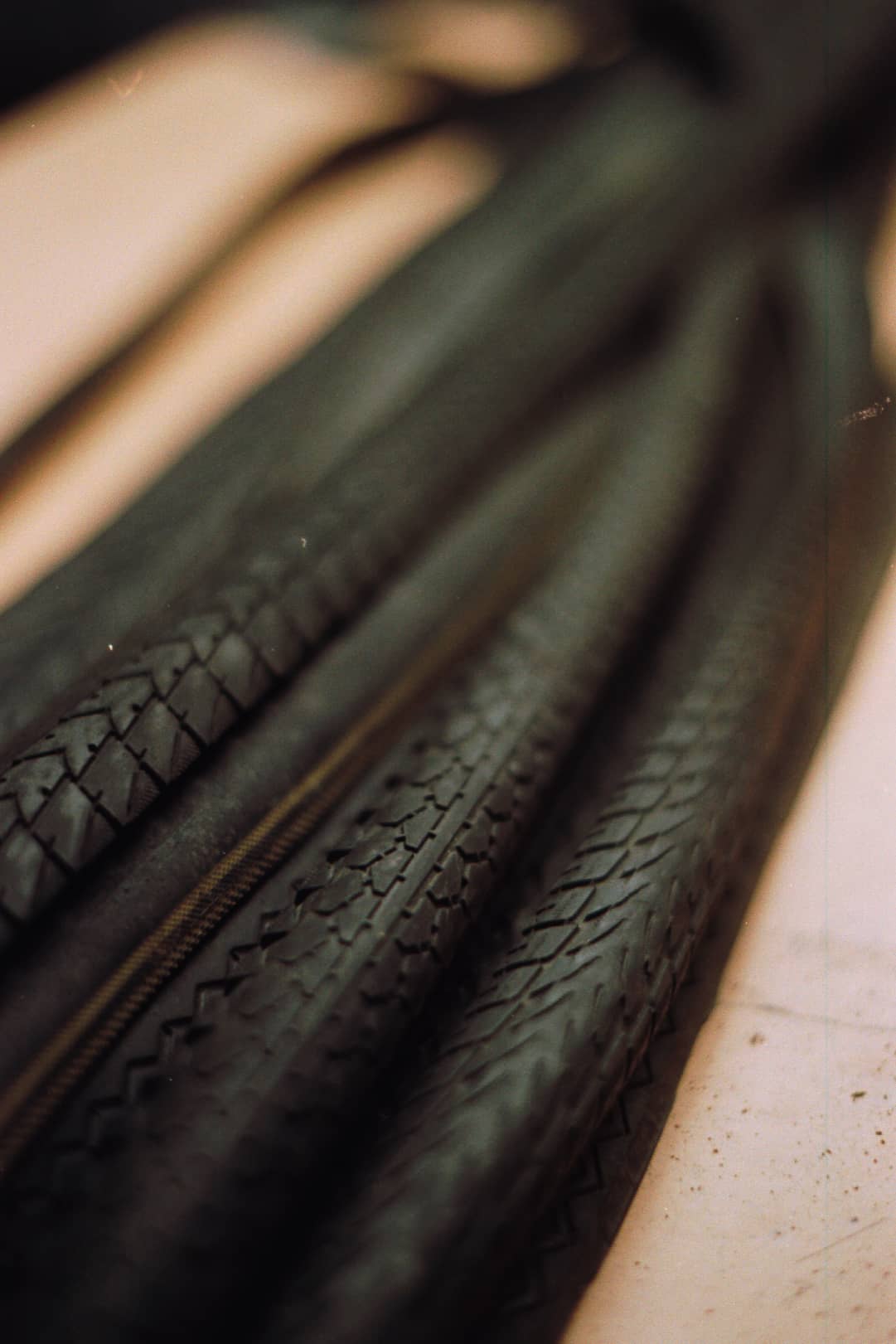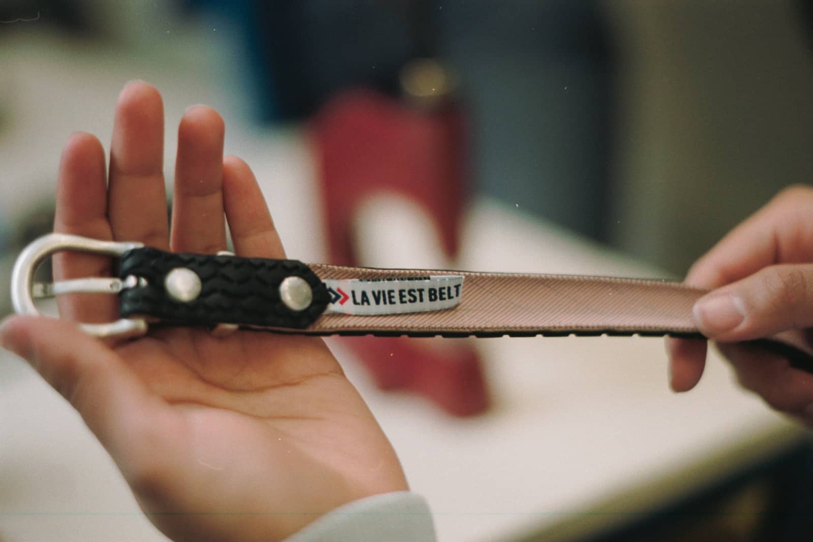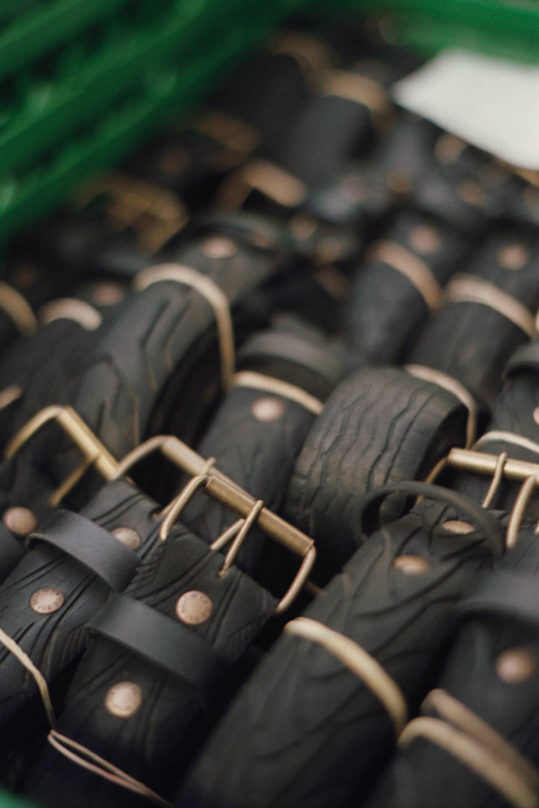Quelques images argentiques rapportées des ateliers de La Vie est Belt, marque lilloise fondée sur le principe de l'upcycling. Les vieux pneus de vélo, glânés auprès des enseignes de sport, démarrent ici une nouvelle vie : ceintures, porte-clés, etc.